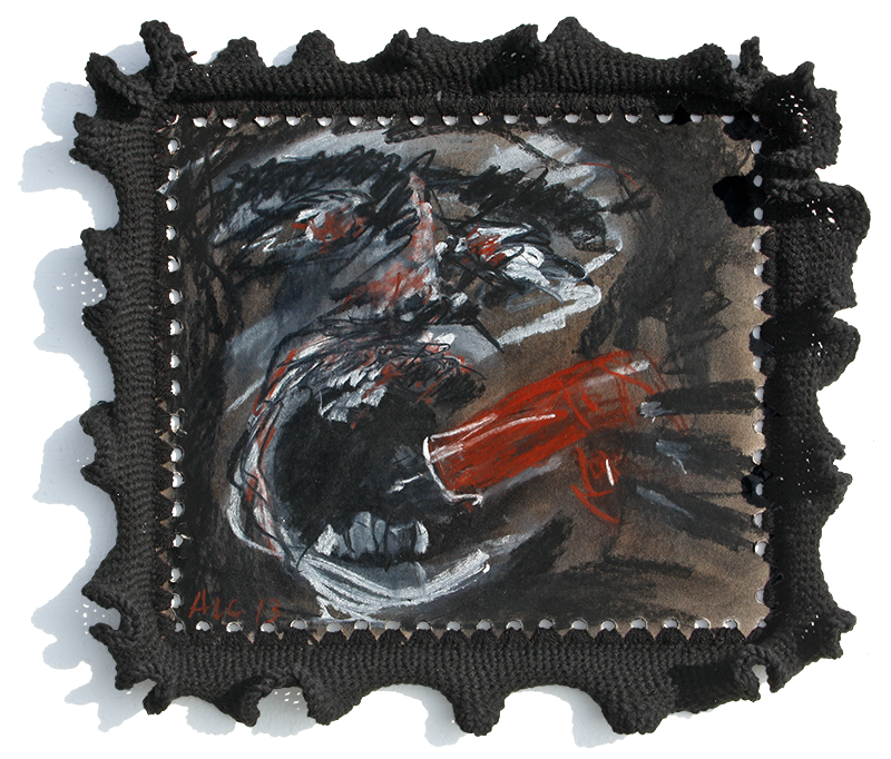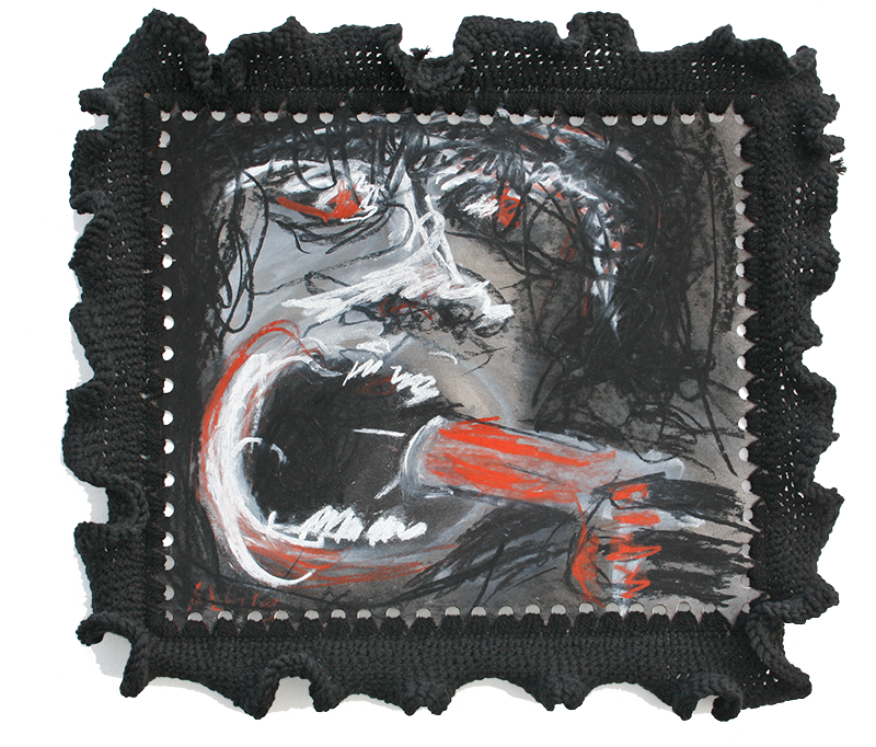 Technology: Charcoal, red chalk and chalk on cardboard - and around crochet with acrylic wool