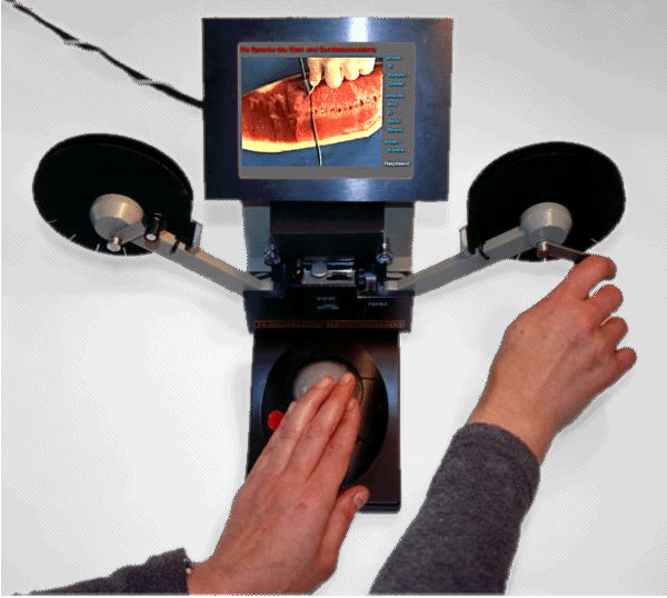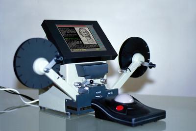 Using the Super 8 viewer, the visitors interactively get information about the theory of "the ceremony of cutting fruit and vegetables". Texts, photographs, videos, and computer graphics become visible by means of an old Super 8 viewer which has been completely modified. Although the basic principle was kept (turn the crank and you'll see the movie) the material is provided by the (invisible) computer which is manipulated by the visitors through the control knobs of the viewer. The navigation is via a trackball and the sound and video playback is controlled by turning the crank forwards or backwards, with infinitely variable speed. The electronics and software were developed by my self.