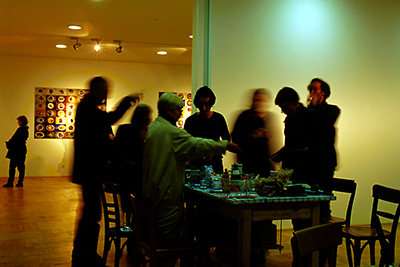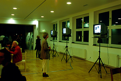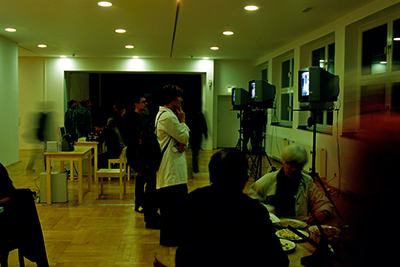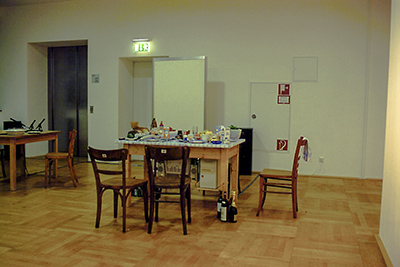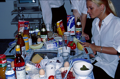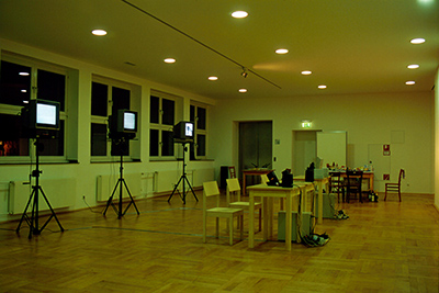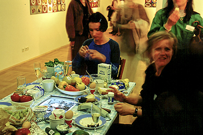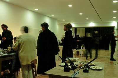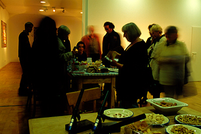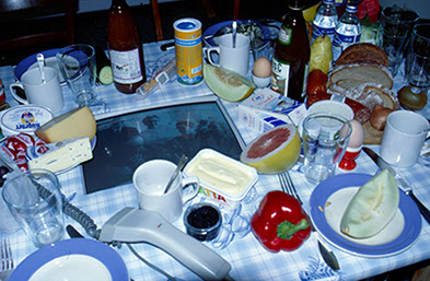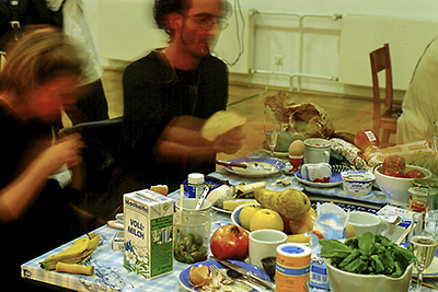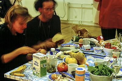 A monitor was embedded in the table. Each item of food on the table, which is meant to be eaten by the visitors, is bar coded. With a hand scanner the visitor can scan the bar codes and so trigger images and sampled sound sequences controlled by my special software.